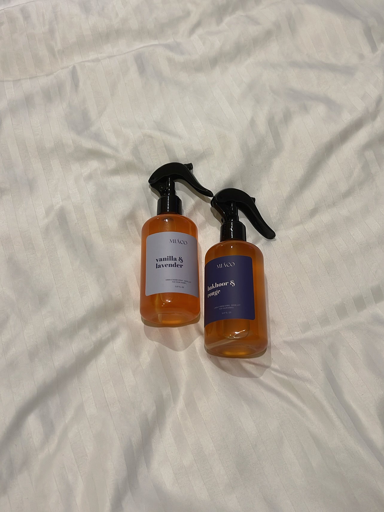 Bakhoor & Vanilla — two moods, one luxury touch. Rich Arabian warmth meets soft, sweet comfort. Whether you want cozy or calming, these MIACO linen sprays keep your space smelling elegant, fresh, and effortlessly inviting.